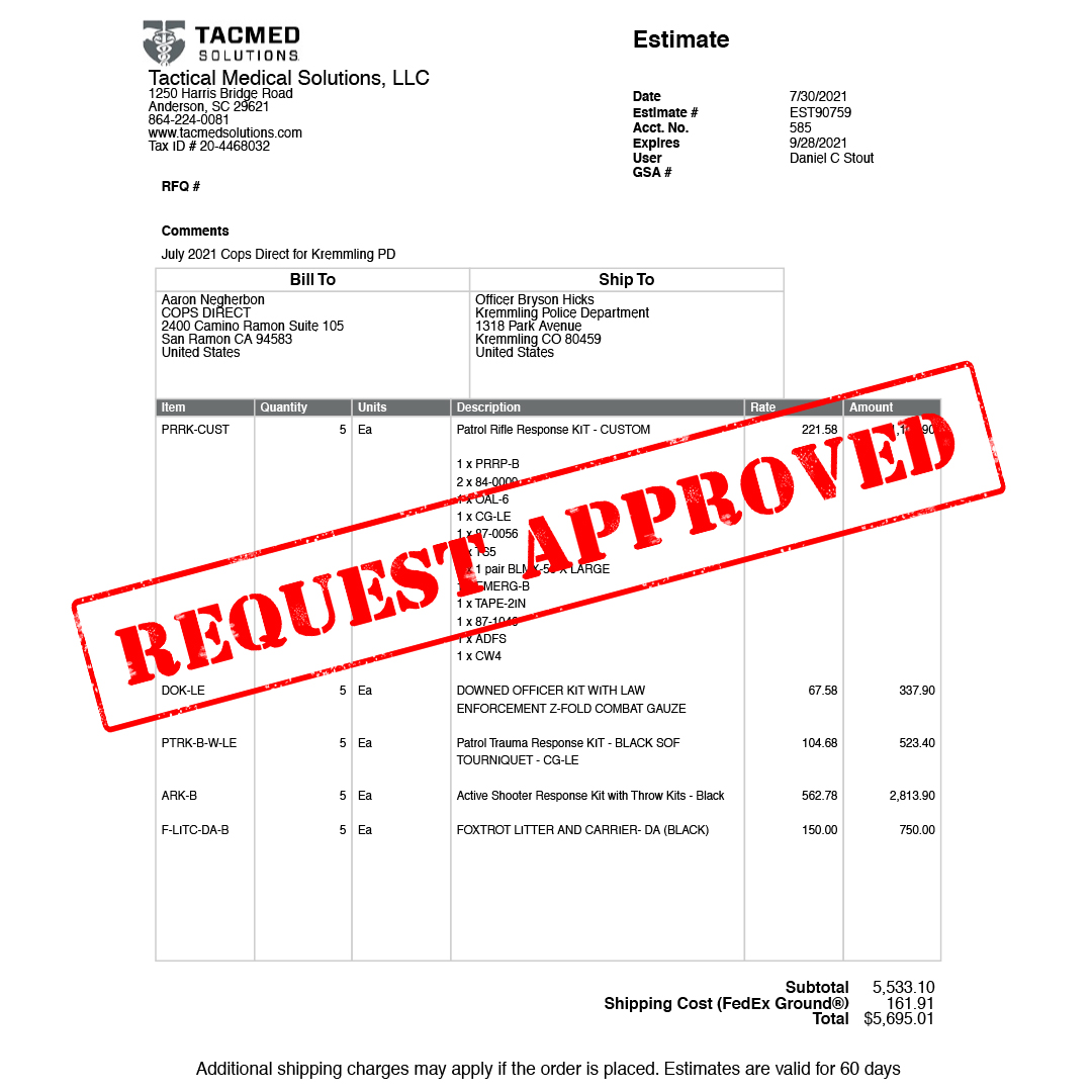 Who can receive these emergency medical kits, training and support? Police Officers, Sheriff Deputies, State Troopers, K9 Units, SWAT Team Members and Search & Rescue Teams are all recipients. This support is provided at no expense to the requesting agency or their personnel.